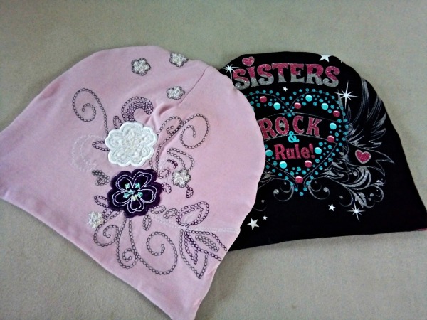 Olen ommellut kierrätyspipoja myös itselleni. Näissä pipoissa kangas on kyllä mukavan pehmeää. Yksivärisiin pipoihin ompelen usein koristeeksi rusetin tai ruusukkeen, niihin voi käyttää pieniäkin kangaspaloja.